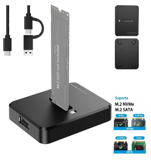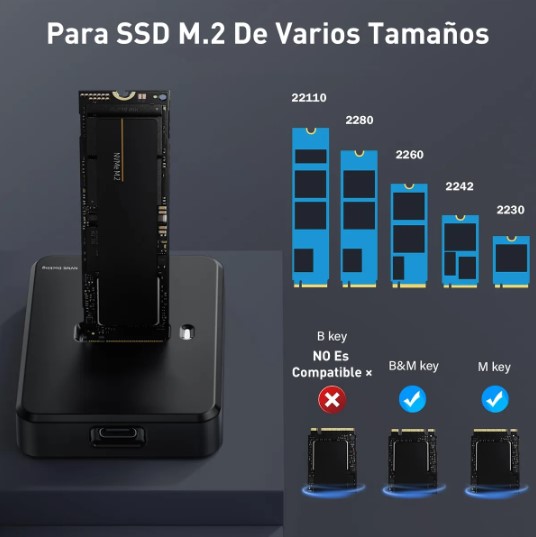 M.2 a USB compatible con SATA/NGFF y NVMe/PCIE en tamaños 2230/2242/2260/2280/22110, como M.2 NVMe/SATA PCIe M key, PCIe B&M key SSD, pero el lector SSD NO es compatible con SSD M.2 SATA AHCI B Key.